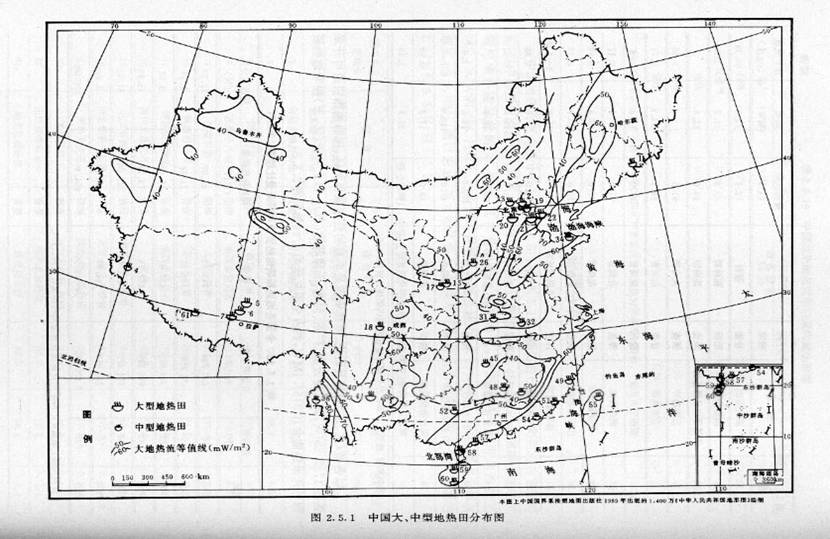 我国是地热资源相对丰富的国家,地热资源总量约占全球的7.9%,可采储量相当于4626.5亿t标准煤。我国的高温地热资源(热储温度≥150℃)主要分布在藏南、滇西、川西以及台湾省,环太平洋地热带通过我国的台湾省,高温温泉达90处以上;地中海喜马拉雅地热带通过西藏南部和云南、四川西部。西藏高温热田主要集中在羊八井裂谷带,其中藏南西部、东部及中部约有108个高温热田,构成中国高温热田最富集的地带;云南是全国发现温泉最多的省,高温热田主要分布在怒江以西的腾冲-瑞丽地区,约2O处;川西分布着8个高温地热区,为藏滇高温地热带的一部分。我国主要以中低温地热资源为主,中低温地热资源分布广泛,几乎遍布全国各地,主要分布于松辽平原、黄淮海平原、江汉平原、山东半岛和东南沿海地区,其主要热储层为厚度数百米至数千米第三系砂岩、砂砾岩,温度在40~80℃左右,已发现全国共有地热温泉3000多个,其中高于25℃的约2200个。从温泉出露的情况来看,我国主要有四个水热活动密集带:藏南-川西-滇西水热活动密集带;台湾水热活动密集带;东南沿海地区水热活动密集带;胶东、辽东半岛水热活动密集带。从地质构造上看,我国地热资源主要分布于构造活动带和大型沉积盆地中,主要类型为沉积盆地型和隆起山地型。